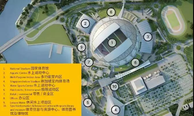 新加坡體育中心包含的場地十分豐富,除了上面照片中明顯的、擁有55,000個座位的國家體育場之外,它同時還擁有水上運動中心、多功能室內場館及大量體育設備。