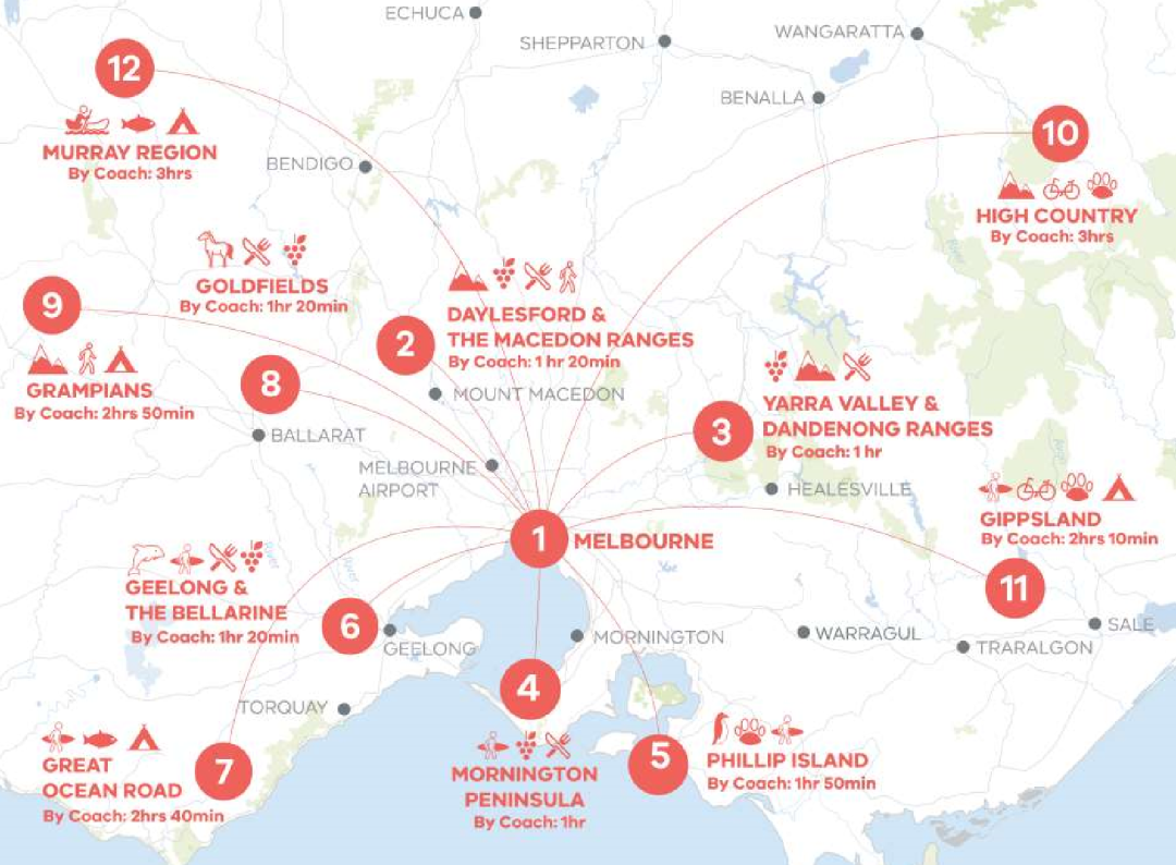 1. 墨爾本 2. 戴爾斯福特和馬其頓山脈 3. 亞拉河谷和丹德農山脈 4. 摩寧頓半島 5. 菲力普島 6. 吉朗和貝拉里尼半島 7. 大洋路 8. 巴拉瑞特和金礦區 9. 格蘭屏山脈 10. 高山地區 11. 吉普斯蘭 12. 莫瑞地區